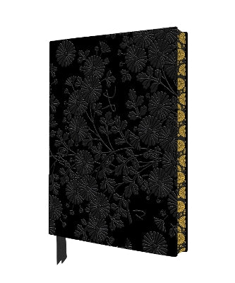 Artisan Art Notebooks, the new Journals from Flame Tree in a range of hues to suit the moment and featuring magnificent art. They’re hand crafted with decorated edges overflowing with petals, teasing vines and patterns. A unique blend of the practical and beautiful, with two ribbons and lined pages, the Artisan Art Notebooks are perfect for notes, creative writing, poetry, doodles and lists. And, with robust flexi covers, they’re easy to slip into your bag, a pleasure to use. Simply, they feel good! This example features the pattern from a lacquer box decorated by lesser-known artist Uematsu Hobi (1872–1933). The box itself is decorated with blossoming chrysanthemums and also features the poem, tsuyu no ma ni, the letters of which are embedded in silver. The background and edges are sprinkled with gold powder and portions of the blossoms and leaves on the top of the box are repeated on the sides.