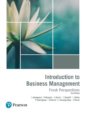 The second edition of Introduction to Business Management: Fresh Perspectives is suitable for first-year courses in Business Management. It covers core theory on the business environment, management theory, management tasks and business functions and is divided into four parts. Each of the four parts is introduced with an infographic that provides an overview of the topics in that part. Building on students’ existing knowledge, the ‘Before you start’ and ‘Think about it’ activities encourage students to think about key topics and to contextualise them. Up-to-date examples from private, public and nongovernmental organisations in South Africa help students apply concepts and at least two new case studies per chapter provide further opportunities for application. To support students, key concepts are highlighted and explained in a textbox, while vocabulary is promoted through a glossary at the back of the book. The review feature includes a chapter summary, critical reflection question, self-assessment questions and case study, with solutions provided at the back of the book.